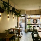 Hinter einem großen Schaufenster gestaltet sich die Einrichtung des einzigen Raumes leger und modern. Da wären neben einer maritimen Tapete zB die Felle auf den Sitzbänken, eine schwebende Leiste mit Pflanzen und die an alte Glühbirnen erinnernden Lampen, die dieses kleine Lokal doch so einzigartig machen.
