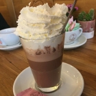 Uns wurden die bestellten Getränke gebracht. Die Schokolade war relativ hell und die Sahne war aus einer Sprühflasche aufgespritzt worden.