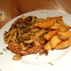 Ein großes, saftiges, ordentlich paniertes und gut gebackenes Schnitzel, leider etwas fettig. Aber anständig im Geschmack. Das Topping aus geschmorten Zwiebeln und frischen Pilzen war reich- wie nachhaltig. Dazu ordentlich (in der Schale) frittierte Kartoffelecken. Am Schnitzel gab es also nicht viel zu meckern. Gut gemeinte 4*.