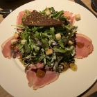 Augenschmaus war das schon mal, also probieren, ob das Gericht auch zum Gaumenschmaus werden würde. Bulgur und Pulpo, ich kann mich nicht erinnern, ob ich das schon mal zusammen auf einem Teller hatte. Aber das passte gut, der Bulgur war zurückhaltend aromatisch und ergänzte den mundfüllenden marinierten Pulpo. Leckeres Gericht, auch ich war zufrieden. Die zweite Dame am Tisch hatte sich für mediterrane Gemüse-Gazpacho mit schwarzem Bergpfeffer entschieden.