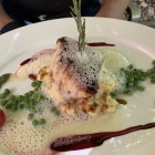 Hmm, gerollter Flammkuchen? Ich denke, dass war dann eine sehr freie Interpretation eines klassischen Flammkuchen. Ich vermute, dass es ein Teig in dieser Richtung war, der Belag ging dann eher in Richtung Tomate und mediterrane Aromen. Das war kombiniert mit einer süß sauren, asiatisch anmutenden Sauce. Kleiner Happs vorweg, es durfte dann auch gerne mal losgehen mit Gang 1.