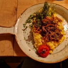Die Cremige vom Bergkäse – war eine dicke, cremige und kräftige Suppe aus sehr herzhaften Bergkäse, obenauf mit krossen Röstzwiebeln. Statt Petersilie war auch hier wieder Schnittlauch vorhanden. Diese Suppe war sehr lecker, allerdings hätte sie für meinen Geschmack etwas heißer sein können. Ob das aber ob des Käses machbar ist? Ich weiß es nicht.