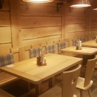 Der Gastraum ist ausgestattet mit rustikalen Tischen und Stühlen aus Holz, die Stühle sind nicht gepolstert, was dann nach einiger Zeit nicht unbedingt zur Bequemlichkeit und längerem sitzen im Restaurant einlädt.