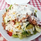 Und der Salat war richtig gut. Eben so wie wir es gerne mögen. Eine ordentliche Menge gut würzigen Joghurtdressings die auch nicht nach Abheben der ersten Blätter schon versiegt und vermisst wird. Insgesamt: Tomaten, Gurken, Mais, rote Bohnen, Blattsalate.