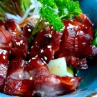Die knackig Salatgurke frisch in Rhomben geschnitten, dazu gehackter Knoblauch, zerdrückter roter Pfeffer und getrocknete (milde) rote Chilispitzen, die angenehm knusperten. Ich hatte zwar mehr Feuer erwartet, aber aus einem eher langweiligen, wässrigen Produkt war ein frischer Auftakt mit deutlich asiatischer Herkunft geworden.