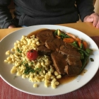 Beim Rinderbraten gab es zwei Scheiben Fleisch. Dieses war auch super zart und saftig geschmort, man konnte es mit der Zunge zerdrücken. Auch einwandfrei Gewürzt. Beim Verhältnis Spätzle und Gemüse sind wir nicht so richtig glücklich gewesen. Erster Anblick war – ja da werden unter dem Gemüse noch welche sein. War nicht so, die man sieht war alles, nicht mehr. Finden wir zum Verhältnis Fleisch doch ein wenig sehr wenig. Sie hatten eine schöne Konsistenz waren einwandfrei gegart, hatten genügend Salz abbekommen und schmeckten uns. Das Gemüse bestand aus Brokkoli, Gelberüben, Zuchini und grünen Bohnen. Es kam uns gedämpft vor war noch knackig und auf den Punkt gegart aber sehr Natur pur. Hier hätten wir uns ein wenig Salz gewünscht.