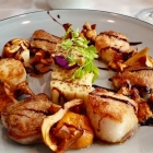 Die drei Wachtel-Suprêmes waren zwar durchgebraten (wie das die Gästeschaft hierzulande nach häufig erhaltener Auskunft von Küche und Service so wünscht), aber saftig und mit schönen - doch, doch - Röstaromen. Leider war die Haut nicht mehr knusprig; das Foto schmeichelt da dem Geflügel ein wenig. Dafür die drei Muscheln mal leicht mehliert gebraten und sehr gelungen. Wirklich sehr gut auch die Pfifferlinge. Bei so einer Qualität muss der Koch nicht mehr viel machen, außer sie à point aus der Pfanne zu nehmen. Tricky der mit Mokka und Chili weiter aromatisierte Balsamico. Zur Wachtel exzellente Ergänzung, ächzten Pilze und Schalentiere doch arg, wo sie von der Geschmacksbombe getroffen worden waren.