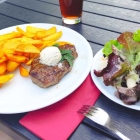 Rumpsteak und Zwiebelrostbraten waren perfekt im Gargrad, fein gewürzt und schön zart. Das waren schon gute Hausnummern. Eine ausgezeichnete, offensicht- und schmacklich selbst gemachte Kräuterbutter zierte das Rumpsteak. Eine ebenbürtige Zwiebelschmälze und dunkle Soße zum gleichnamigen Rostbraten ein richtiges Pfund! Gerne immer so. Und mehr!