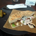 Natürlich war dieser Fladenbrot-Snack vom Aussehen her irgendwo zwischen veganem Falafel-Döner und Shawarma-Sandwich angesiedelt. Aber damit hatte meine Herzensdame ja auch gerechnet. Außerdem lobte sie die mit Sesam bestreute Brothülle, deren Krume angenehm fluffig daherkam. Da machte sich die Qualität des regionalen Bäckers positiv bemerkbar.