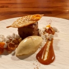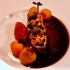 In diesem Fall cremiger Ziegenfrischkäse, in den Tonkabohne eingearbeitet worden war. Davon ein Ring gebettet auf Granny Smith und einer Gel-Matte ebenfalls vom erfrischenden Apfel bedeckt, der dem Ganzen mehr fruchtige Frische einhauchte, als es die üblichen Mitspieler zum Käse sonst so tun. Sehr passend zum stets leicht säuerlichen Ziegenkäse. Mit der knackigen Scheibe schwarzer Walnuss wurde nochmals eine übliche Beilage zur Käseplatte spielerisch zitiert. Ungewöhnlicher, aber saisonal stimmig die frisch gehobelten Späne Wintertrüffel, dessen Stärke eher im Duft als im kräftigen Geschmack liegt.