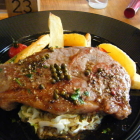 Essen und Trinken: Meine Frau bestellte zum Trinken ein kleines Mineralwasser Tönis classic (0,25l EUR 2,40) ich hatte ein dunkles Weizen der mir unbekannten Brauerei Gutmann (0,5l EUR 4,20) ; es schmeckte, mehr gibt es dazu nicht zu sagen. Beide entschieden wir uns für die "Empfehlung des Tages", das "Rumpsteak US Beef 200gr. auf Spitzkohlgemüse mit Rosmarinkartoffelspalten, Cocktailtomaten und Madagascarsauce". Als Preis waren uns EUR 28,00 genannt, auf der Rechnung fanden sie sich allerdings mit jeweils EUR 29,50 wieder. Als Vorspeise hatte meine Frau die "Suppe des Tages" für EUR 3,00. Heute war es eine Kartoffelsuppe mit Croutons, die zwar geschmacklich in Ordnung, dafür aber ziemlich kalt war. Nicht vom Hocker gerissen hat uns beide die "Empfehlung des Tages"; ich hätte dieses Gericht nicht empfohlen. Das Rumpsteak vom US Beef war zwar geschmacklich in Ordnung, aber für meine Begriffe untergewichtig; die annoncierten 200 Gramm wurden nicht erreicht, für mich waren es allenfalls 180 Gramm, möglicherweise sogar leicht darunter. Dafür EUR 29,50 zu verlangen verlangt schon ziemlich Chuzpe; mit dem als "Klassiker" annoncierten "Unser Rumpsteak (200gr.) mit Pommes, Café de Paris-Butter und Salat" für EUR 22,00 wären wir vermutlich besser gefahren. Sehr loben muss ich die leicht süßliche Madagascarsauce, eine laut Chefköchin Luna "viermal einreduzierte Jus, veredelt mit Madagascarpfeffer". Fast unterschlagen hätte ich den Küchengruß, ein Körbchen mit Weissbrotscheiben und einem Tiegelchen mit gesalzener Butter; eigentlich beides nicht weiter erwähnenswert. Für "Essen" vergebe ich sehr gut gemeinte drei Sterne; mehr ist für die heute gezeigte Leistung aus meiner Sicht nicht drin. Und "wer im Glashaus sitzt sollte nicht mit ganzen Pfefferkörnern schmeissen". Chefköchin Luna (eine unserer Katzen heisst Luna Peppina) hatte bei "Mein Lokal, dein Lokal" moniert, dass einer der Mitbewerber mit ganzen Pfefferkörnern gearbeitet hatte. Sie selbst hat über unser US Beef ganze Pfefferkörner quasi mit vollen Händen ausgestreut; wir haben sie einfach zur Seite geräumt. Die Pfefferkörner, nicht die Luna.