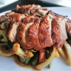Die bereits tranchierte Brust vom Lieblingsvogel der Chinesen hatte ihr Fettbad im Wok gut überstanden. Sie lag außen knusprig und innen noch schön saftig auf einem ansehnlichen Hügel knackig gewoktem Gemüse.