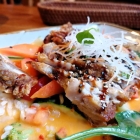 Die knusprigen Nem bescherten mir einen durchaus schmackhaften Einstieg ins Mittagessen. Ihr Fettgehalt verstärkte diesen Eindruck nicht unerheblich. Die dazu gereichte, süße Chilisauce hätte ruhig noch etwas schärfer ausfallen dürfen. Diese begegnete meinem Gaumen mit zu viel asiatischer Zurückhaltung.