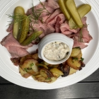 14 Tage vorher,hatte er Gänsebrust und war auch davon sehr begeistert. Er hat immer auf den Knochen gewartet,aber es war nur reines Fleisch und die Portion war so groß,dass er die Beilagen nicht ganz schaffte.