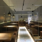 Weiter nach hinten zieht es sich wie ein langer Gang weiter und es gibt rechts und links verschiedene Sitzmöglichkeiten für unterschiedliche Personenzahlen. Hier gibt es noch die Plexiglas Abtrennungen zwischen den Sitzmöglichkeiten.