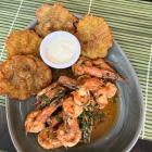 Gegenüber ganz anders: Die schalenfreien Gambas Caribeña („Gambas im Wok flambiert mit Knoblauch- Limettensaft, frittierte Kochbanane und Aioli“) für 17,50 € hatten neben dem knobigen Sud auch reichlich Koriander als Würzung mitbekommen und waren ein Volltreffer. Die frittierte Kochbanane erinnerte an stark ausgebackene Kartoffelpuffer. Das Aioli eine säuerliche Industriesoße und zum Vergessen.