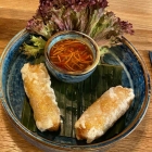 Nach einer Weile kamen auch schon unsere Vorspeisen. Diese waren auf stilvollen Tellern passend zum Konzept sehr liebevoll angerichtet. Es wurden zwei Frühlingsrollen mit einer süß-scharfen Soße auf einem Palmenblatt serviert. Wir merkten direkt, dass die Rollen frisch zubereitet wurden, da sie sehr kross waren und nicht wie eine typische Standard Frühlingsrolle ausgesehen haben.