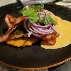 · 1x Hamburger Pannfisch ''Ahoi Style'' – ein Gebratenes Kabeljaufilet mit Kartoffelpuffern, krossem Speck, Apfelmus und leckerer Senfsauce für 17,90 €