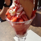 Am Erdbeerbecher gibt es nix zu meckern. Frisches, selbst gemachtes Eis, mit frischen Erdbeeren. Am Spaghetti Eis war ebenfalls alles in Ordnung, die Waldbeeren waren ebenfalls frisch. Nur die kleine meckerte etwas. Das Eis war lecker, das enthaltene Himbeereis versteckte zur Überraschung viele kleine Schokostückchen im inneren. Bei den Früchten war sie nicht ganz so zufrieden, und statt frischer Früchte gab es hier den Pfirsich und die Ananas aus der Dose, und dafür auch einen Punkt Abzug. Die anderen Früchte wie Blaubeeren und Erdbeeren waren frisch. Ich war mit meinem Windbeutel mit Eis und Erdbeeren überaus zufrieden, war das doch mal eine andere Kreation, die ich so als Windbeutel noch nicht kannte.