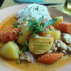 Kein Wunder, stand doch da schon das mit üppigem Kartoffel- und Karottenbesatz aufs Porzellan gehievte Hähnchencurry vor meinem Senior und wollte von ihm verspachtelt werden.