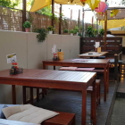 Vertieft zur Straßenebene betritt man die Außenterrasse. Und genau das sorgt dafür, dass die Außenplätze längs am Gebäude für die Gäste ruhiger liegen. Gepflegte Pflanzkübel, unter anderem mit Bambus, sorgen für eine gemütliche Atmosphäre.