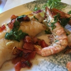 Der Lachs hatte einen guten Gargrad und war saftig. Der kleine Tintenfisch war ordentlich gegart, hätte für mich aber noch etwas gegrillt sein dürfen. Soe waren die Stücke zwar gar, jedoch auch etwas elastisch. Bei den Garnelen handelte es sich um zwei Sorten. Auf dem Teller links war ein Exemplar ohne Kopf. Das Stück war saftig und angenehm im Geschmack. Die beiden auf der rechten Seite waren leider (wie oben) etwas trocken.