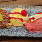 Crème brûlée von weißer Schokolade, Rosmarin, Beerensorbet mit Früchten und Walnuss aus dem eigenen Garten, Schokosahne - € 7,80.