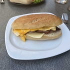 Panini , ja , da hatte ich irgendwie so im Hinterkopf dass es sich um so ein getoastetes Brötchen/Toastbrot mit so Grillstreifen drauf handelt. Tja , es war halt eine längliche kalte Semmel. Die war jetzt nicht schlecht, schön weich , nicht knusprig, aber hatte was anderes im Kopf bei der Bestellung als eine belegte Semmel. Der Käse war kalt, nicht zerlaufen und Geschmack hatten wir auch vermisst. Der Speck und das Rührei war das gleiche wie beim anderen Gericht, dazu kommen wir noch. Panini war es für uns nicht , sondern einfach eine belegte Semmel in kalter Form.