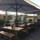 Es ist ein schöner Außenbereich ( das Foto entstand am Morgen schon als sie gerade eingedeckt hatten). Es ist von der Fußgängerzone schön abgeschirmt durch viele Blumenstöcke und es wird durch Schirme beschattet. Es gibt hier Holzbänke und Holztische dazu. Zum was essen geht es , zum länger verweilen nicht ganz so bequem. Hier muss man auch rechnen das andere mit an den Tisch platziert werden.