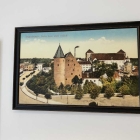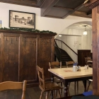 Rechter Hand kommt man in einen anderen Raum. Es ist alles mit dunkleren Holz verkleidet. Oben drüber hängen Bilderrahmen mit alten Bildern von früher. Hier gibt es an einem Bereich eine Eckbank mit hellen Tischen und dunklen Stühlen dazu. Auf der Bank liegen ein paar dünne Sitzkissen aus, auf den Stühlen wären solche auch nicht schlecht in etwas dicker zum besser sitzen.