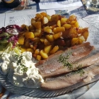 die Matjesteller brauchten noch einmal 20 Minuten. Was so lange gebraucht hatte, da die Außentische noch nahezu unbesetzt waren, erschließt sich uns zwar nicht so ganz, aber dafür erwartete uns ein guter gefüllter Teller. Drei ordentlich große, angenehm gewürzte und zarte Matjes lagen neben einen großen Berg frischer, krosser Bratkartoffeln. Diese waren mit reichlich Speck und Zwiebel gebraten. Allerdings waren sie leider auch deutlich zu fettig, da war wohl zu viel Schmalz im Tiegel. Die Hausfrauensauce war mit reichlich Apfel-, Zwiebel- und sauren Gurkenstückchen angerührt-lecker. Dazu noch etwas frischer Salat-ein gutes, ausreichendes Essen.