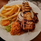 Die Platon Platte war mit je einem Hähnchenbrustfilet, Suvlaki (Fleischspieß), Schweinesteak und zwei Suzuki(griechische Frikadellen) bestückt. Bereits auf den ersten Blick fiel auf, das die Fleischstücken sehr stark angebraten waren, die dunklen bis fast schwarzen Grillstellen auf dem Fleisch zeugten davon. Dies hatte natürlich zur Folge das zumindest der Suvlaki, das Schweinesteak und die beiden Suzuki recht trocken wirkten. Einzig das Hähnchenbrustfilet war angenehm weich und nicht trocken. Das Fleisch als auch die Suzuki waren sehr herzhaft gewürzt, die Zuzuki fast schon zu scharf. Als Beilage gab es auf den Punkt frittierte Pommes und Eine Kugel würzigen Reises.