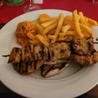 Meine Frau hatte sich heute für die Platon Platte entschieden. Die Platon Platte war wieder mit je einem Hähnchenbrustfilet, einem Suvlaki, dem Fleischspieß, einem kleinen Schweinesteak und zwei Suzuki, den griechischen Frikadellen, bestückt. Die beiden Suzuki, der Fleischspieß als auch die beiden Steaks waren gut angebraten, Grillspuren waren auf allen deutlich zu sehen. Dabei war heute, im Gegensatz zu unserem letzten Besuch das Fleisch überhaupt nicht trocken. Heute hatte der Koch die Stücken rechtzeitig vom Grill genommen, denn sowohl das Fleisch als auch die Suzuki waren noch schön frisch und saftig. Das Fleisch der Steaks als auch die Suzuki waren sehr herzhaft gewürzt dabei aber nicht zu scharf wie beim letzten Mal. Als Beilage gab es wieder auf den Punkt frittierte, krosse Pommes und eine Kugel würzigen Reises.