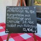 Als nächstes der Hinweis auf das Tischaufstellerchen, das verschiedene Pfifferling-Gerichte bewarb. Auf meine bange Frage nach deren Herkunft – hier im Schwarzwald ist es ja noch zu früh, und Pilze aus Weißrussland wollte ich noch nie, jetzt aber erst recht nicht – kam die beruhigende Auskunft, dass sie aus Italien stammen und somit einer Überlegung wert waren. Aber der Reihe nach.