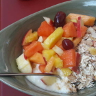 Das Rührei erscheint zusammengeklappt wie ein kleines Omelett, wird mit reichlich krossem Speck, frischem Feldsalat, Gurke und Tomate serviert und von zwei Baguettescheiben begleitet. Schmeckt wunderbar, ist topfrisch und für 5,80 Euro zudem noch unglaublich günstig. Auch das Müsli (6,80 Euro) mit Naturjoghurt, Obstsalat, Haferflocken und Kernen kann sich sehen lassen und erfrischt wunderbar. Schön, dass man hier für die Speisen nicht weisses Einheitsgeschirr verwendet, sondern Schalen und Teller in marmorierten Grünschattierungen. Einziges Manko: zum Müsli wird keine Serviette gereicht.