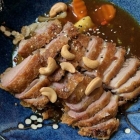 Knusprige Ente Kung Pao mit buntem Gemüse im Wok gebraten (12,90 €). Kung Pao kommt aus Sichuan, ist wie fast alles von dort ziemlich scharf und war mit einer Chilischote gekennzeichnet. Normalerweise mit Erdnüssen, handelte es sich hier um eine de-luxe-Version mit Cashews. Ich musste mir natürlich das Leben schwerer machen als nötig, indem ich die Kellnerin bat, die Chili-Markierung ernst zu nehmen. Daraufhin bekam ich etwas serviert, das irgendwas zwischen zwei, wenn nicht drei Schoten verdient hätte. Am Anfang schoss mir das Wasser in Augen und Nase, später wurde es besser, und hätte ich nicht zu Beginn das ganze Wasser bestellt, hätte ich es spätestens jetzt getan. Genossen hatte ich es trotzdem, denn die Ente war ein saftiges Vögelchen gewesen und hatte von dem für Sichuan zuständigen Chefkoch eine herrlich knusprige Haut verpasst bekommen. Das würde ich unbedingt wieder bestellen, allerdings vorher die Klappe halten.