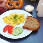 Das Rührei meiner lieben Frau sah gut aus, schmeckte auch so und war noch mit etwas Kresse versehen. Zwei Tomatenachtel der nicht besonders nennenswerten Art und zwei Gurkenscheiben begleiteten das Rührei. Das Brot war gut und „saftig“ wenngleich es auch bessere gibt. Jammern auf anständigem Niveau ;-)