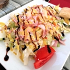 Noch eine kleine Anmerkung zum Italienischen Salat. Ein gutes Dressing kann einen solchen zum wahren Zungenschnalzer erheben. Zu viel der guten Tunke kann jedoch auch das genaue Gegenteil bewirken. Sei es drum, die mit reichlich Käse und Kochschinken garnierte Eisbergplatte mundete deutlich besser als es der vielfarbige Quetschflaschenmissbrauch anfänglich vermuten ließ. Das war zwar kein Fest für das mitessende Auge, konnte aber wenigstens mehr geschmackliche Wirkungstreffer landen als optische.