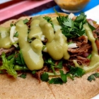 Die kleinen Tacos selber halt Tacos mit gezupftem, etwas trockenem Fleisch aus der Pfanne, rohen Zwiebeln, Koriander und wieder Avocadocreme.