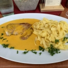Hirschragout mit Spätzle und gemischten Waldpilzen, dazu Preiselbeer-Birne und ein Salatteller war ihre Order. Was meine Frau alles so essen kann, wenn wir wandern! Es schaute aber lecker aus, was die Küche dort servieren ließ. Nach dem Mittwochabend in Bernkastel auch hier ein Schmorgericht, und wieder war meine Frau glücklich mit ihrer Wahl. Meine Wahl war etwas exotischer.