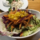 Der Beilagensalat wird ebenfalls vorweg serviert. Der Salat, die Tomaten- und Gurkenstücke sind frisch; dazu kommt noch etwas Mais (aus der Dose).