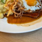 Ein wuseliger und aufgeweckter Ober ist rasch zur Stelle und präsentiert die Speisekarte (überschrieben mit: Middagsdisch). Während die Hauptkarte auch etwas höherpreisige Speisen wie Saibling in Kümmel-Majoran-Öl (22,50 Euro) oder Filet vom Schwäbisch-Hällischen Landschwein (23,70 Euro) präsentiert, bietet die abgespeckte Mittagskarte Beliebtes und Eingängiges zu günstigen Preisen: Flädlesuppe, Maultaschen, Linsen mit Spätzle, Wurstsalat mit Schwarzwurst. Die „Gebratene Scheibe vom Leberkäse mit Kartoffelsalat, Bratensauce und Spiegel-Ei“ (9,50 Euro) ist eine gute Wahl. Leberkäse und Spiegelei sind schön resch gebraten, die fein ziselierten Zwiebelstreifen darüber wunderbar kross und knackig. Doch der Kartoffelsalat ist schlichtweg der Hit: schön schlonzig (wie ich es mag), jedoch mit einem überraschend fruchtigen Essig angemacht, der für ganz ungeahnt frische Geschmacksnoten sorgt. Davon könnte ich mehr haben. Zum Leberkäse passt hervorragend das helle Wulle-Bier (4,00 Euro für das Fläschchen), das jedoch auch etwas sediert. Um das Haupt nicht auf das einladende Polster unseres Separees zu senken, braucht es also noch einen Kaffee (2,80 Euro). „Hochland“ steht auf der Tasse – ob auch welcher drin war, kann ich nicht beurteilen.