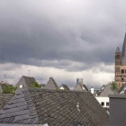 Der Himmel war also bewölkt, gelegentlich gab es eine heftige Schauer. Wir sind zur Begrüßung doch noch zur Dachterrasse gekommen. Man hat tatsächlich einen schönen Blick zum Dom und auch Groß Sankt Martin und den Rest von Köln. Aber dann haben wir uns alle ins Innere verzogen. Daniel Gottschlich hatte natürlich vorsorglich einen Plan B!