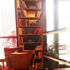 Während es in der Küche mächtig zischt und brutzelt, nutze ich die Gelegenheit, das Ambiente auf mich einwirken zu lassen. Könnte genauso eine Hotellobby in Antalya wie ein kerniges Lokal in Arkansas sein: sehr viel dunkles Massivholz, weich gepolsterte Retro-Sessel und massige, ausladende Ledersofas, dazu Kristallkronleuchter und Leselampen. Dazwischen Bibliotheksregale, deren Bestand ich erst als reine Deko hinnehme. In einem unbeobachteten Moment greife ich einige Bände heraus und sehe erstaunt: alles bibliophile Ausgaben aus dem letzten Jahrhundert, alles echt. Trotzdem wirkt das ganze Interieur irgendwie wie eine Filmkulisse und ein bisschen strange. Soll der unterkühlten Business-Umgebung draussen aber wahrscheinlich einen gemütlichen Gegenpol bieten.