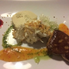 Es ging so gut weiter. Ein butterzarter rosa Seesaibling schmiegte sich in aromatisch Hummersauce und wurde von Schnippelbohnen/Lauch/Quinoa-Beilage begleitet - auch rundum lecker. Zweiter kleiner Fischgang war ein mit leichtem Tandoorideckel versehener blättriger Kabeljau, angegossen die klassische Tom Ka Gai mit viel Zitronengras, dazu Spinat und Beluga, das Raukeöl brachte noch ein bisschen pfeffrige Schärfe hinzu. Einziger Kritikpunkt wäre, dass hier mit Tandoori und dem intensiven Thai-Sud schon sehr viel zusammenkam, was vielleicht den ein oder anderen überfordern könnte. Uns hat es geschmeckt! Leider waren die Sessions aus dem Meer damit passé.