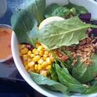 Die Bowls werden in der runden Pappschale ausgegeben, die Dips extra im Plastikdöschen. Das Geschäft läuft überwiegend über die Straße. Der Laden selbst ist nicht richtig zum vor Ort essen eingerichtet, nur eine kleine Theke im Schaufenster ist vorhanden.