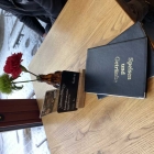 Auf dem Tisch gibt es Aufsteller mit Angeboten zu trinken , die Gudzerla Erklärung und frische Blumen.