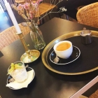 Das vom Architekturbüro Lederer + Ragnarsdóttir + Oei umgebaute Stadtpalais wirkt in seiner klaren Farben- und Formensprache für manche etwas unterkühlt. Mir gefällt es allerdings sehr. Auch das Café Drinnen & Draußen hält sich hier genau an die Vorgaben. Farblich dominieren Schwarz und ein helles Beige. Man sitzt an quadratischen, dunklen Holztischen. Die ergonomisch geschwungenen Stühle mit Rattangeflecht erweisen sich als äusserst bequem. Jeder Tisch ist nett, aber unaufdringlich geschmückt – mit einem Blumenarrangement, einem Kräutertopf, einer Kerze. Alles ist megaproper und wie geleckt. Nirgendwo ist auch nur das kleinste Bröselchen zu sehen. Das benutzte Geschirr darf man selbst auf einem Board deponieren, es wird dann sofort abgetragen. Einziges Manko: die Musikbeschallung ist kaum auszublenden und schlichtweg ärgerlich. Hat an einem eher ruhigen Ort wie diesen für meinen Geschmack nichts verloren, behindert eindeutig ein Gespräch oder eine Lektüre.