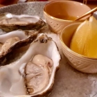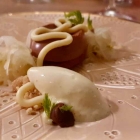 Bevor es mit dem Potpourri losgehen sollte, labten wir uns erst noch an Gillardeau-Austern. Für mich wie stets natur; meine Kolleginnen lobten das zurückhaltende Apfel-Sellerie-Dressing, das den schönen Französinnen nicht die Schau stahl. Geografisch hat das mit Mezze zwar wenig zu tun, aber wenn der Deckungsbeitrag (15€ für eine zusätzliche „Löwen-Ration“ neben den zum Menü gewählten drei Stück) so schmackhaft erhöht wird, wollten wir nicht kleinlich sein. Da zwar die Unterhaltung, aber bislang nichts im Glase perlte, gab es Champagner en rosé. Ich denke, es war Ruinart, zwar nicht zu Dresdener Mondpreisen, aber schon stramm kalkuliert. Mir zu fruchtig; die Kolleginnen waren entzückt.