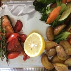 Der Lachs war auf der Haut gebraten. Die Hautseite lag unten. Zur Aromatisierung waren Rosmarin und Zitrone beigefügt worden.